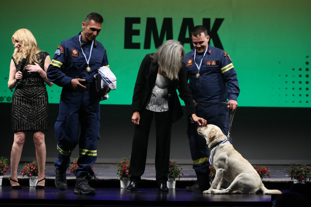 Η ΕΜΑΚ τιμήθηκε σήμερα στο πρόσωπο του Επιπυραγού Δημήτρη Ρούπα, ο οποίος ήταν επικεφαλής της πρώτης ΕΜΑΚ στην Τουρκία. Μαζί του ήταν και ο Σίζαρ, ο σκύλος διασώστης που συμμετείχε στην επιχείρηση της γειτονικής χώρας, καθώς και ο εκπαιδευτής του. Την βράβευση στους εκπροσώπους της ΕΜΑΚ έκανε η πρόεδρος του ΣΕΓΑΣ, Σοφία Σακοράφα, την ίδια στιγμή που η αίθουσα κατακλύστηκε από τα έντονα χειροκροτήματα των παρευρισκόμενων.