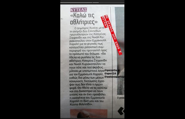 Η πρωταθλήτρια του επί κοντώ, μετά τις δηλώσεις του Δημήτρη Κυτέα, τοποθετήθηκε ξανά μέσα από τα social media. Η Νικόλ Κυριακοπούλου χρησιμοποίησε απόκομμα της εφημερίδας και έγραψε: “Με μεγάλη μου χαρά κ. Κυτέα”.