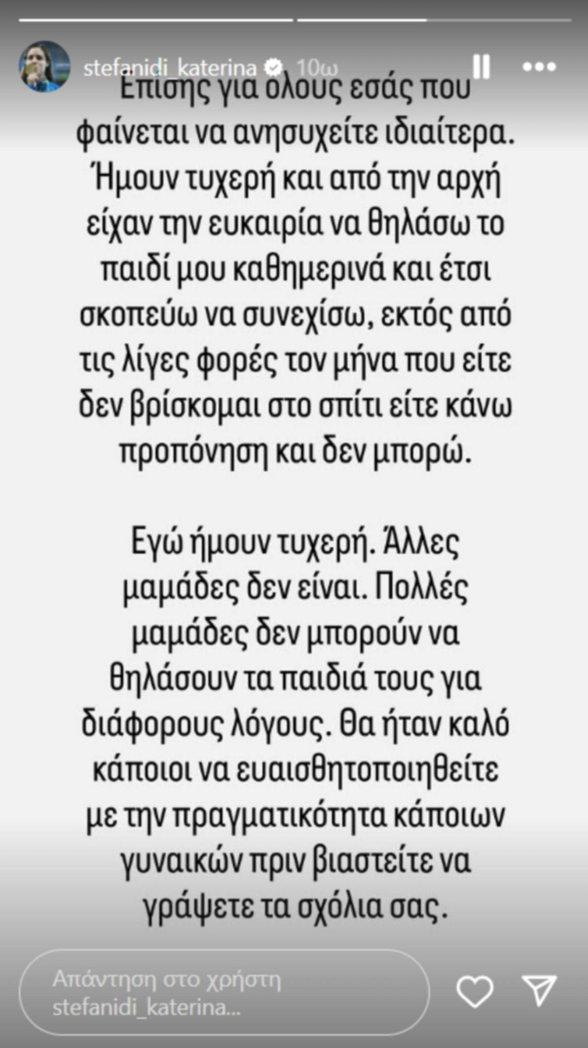 Η Στεφανίδη, θέλοντας να απαντήσει, προχώρησε μάλιστα και σε μία γενικότερη τοποθέτηση σχετικά με τον θηλασμό: “Επίσης για όλους εσάς που φαίνεται να ανησυχείτε ιδιαίτερα.