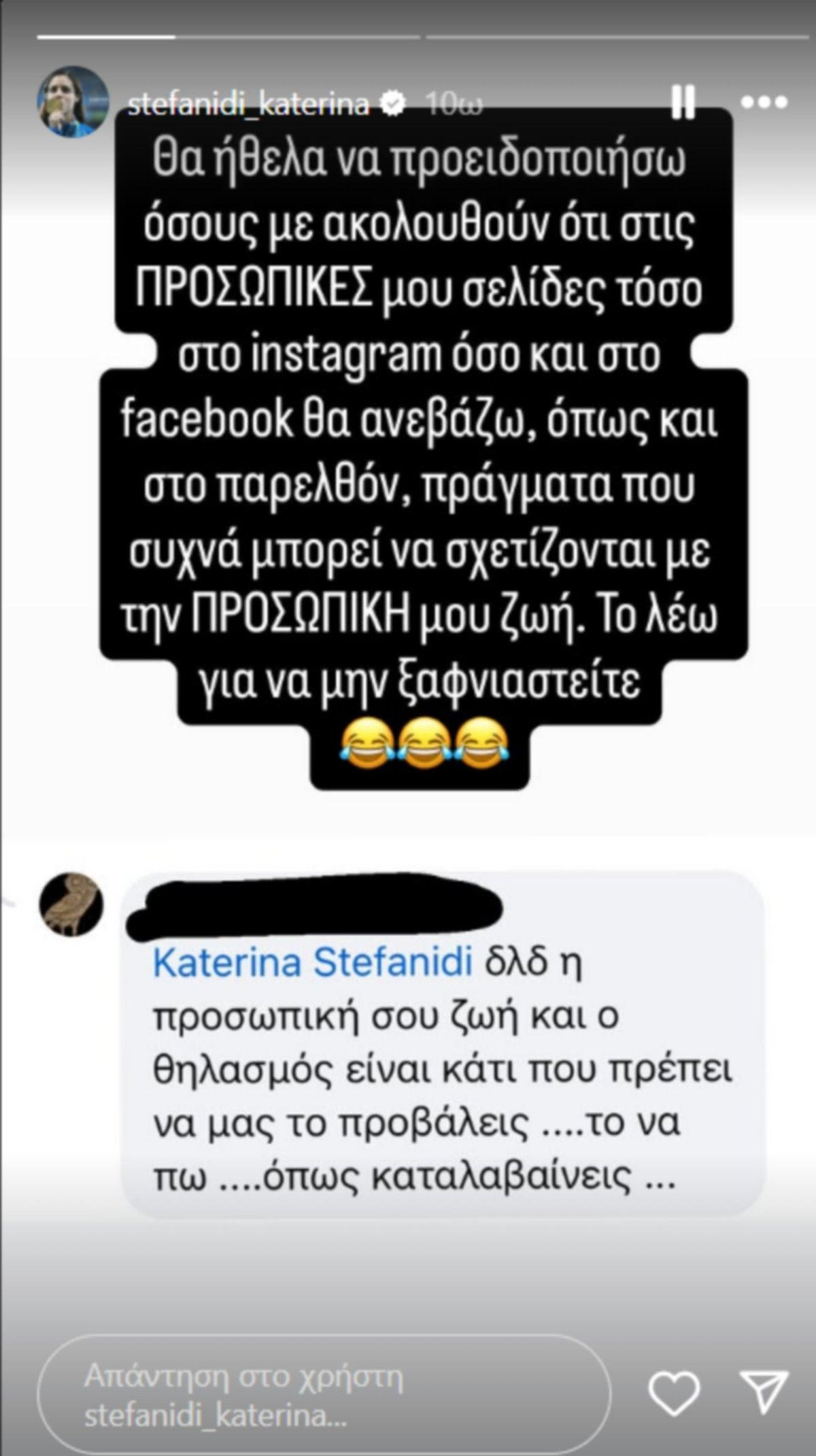 Η Ελληνίδα αθλήτρια θέλοντας να απαντήσει, τοποθετήθηκε μέσω στόρι: “Θα ήθελα να προειδοποιήσω όσους με ακολουθούν στις ΠΡΟΣΩΠΙΚΕΣ μου σελίδες τόσο στο Instagram όσο και στο Facebook θα ανεβάζω, όπως και στο παρελθόν, πράγματα που συχνά μπορεί να σχετίζονται με την ΠΡΟΣΩΠΙΚΗ μου ζωή. Το λέω για να μην ξαφνιαστείτε.”