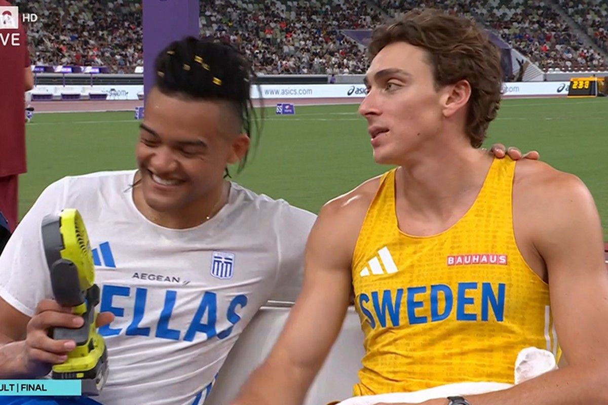 Ο Σουηδός θρύλος του επί κοντώ επιχείρησε να κάνει παγκόσμιο ρεκόρ βάζοντας τον πήχη στα 6.30μ και λίγο πριν απογειωθεί είδε τον Εμμανουήλ Καραλή να τον δροσίζει με ανεμιστηράκι σε μια επική στιγμή.