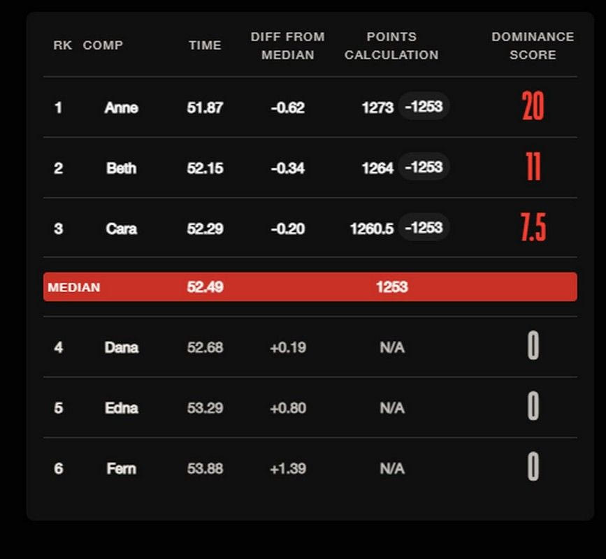 Ο εκάστοτε χρόνος αντιστοιχεί σε μια βαθμολογία, ανάλογη της αξίας της επίδοσης (όπως κάνει η IAAF). Σε κάθε κούρσα θα βαθμολογούνται μόνο όσες επιδόσεις είναι καλύτερες από τον μέσο χρόνο που επετεύχθη στον αγώνα. Οι πόντοι που αντιστοιχούν στον μέσο χρόνο θα αφαιρεθούν από τους πόντους των καλύτερων επιδόσεων και η διαφορά που θα προκύψει θα προστεθεί στο τελικό σκορ του πλασαρίσματος στα αγωνίσματα.