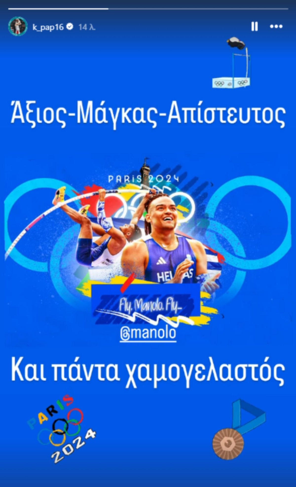 Ενθουσιασμένος με τον θρίαμβο του Εμμανουήλ Καραλή, που κατέκτησε το χάλκινο μετάλλιο στο επί κοντώ με άλμα στα 5.90, ο Κώστας Παπανικολάου μοιράστηκε το βράδυ της Δευτέρας (5/8) το post του SPORT24 για τον 25χρονο αθλητή.