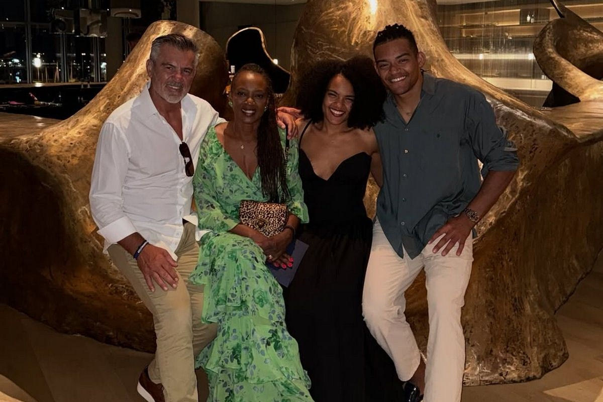 Ο Έλληνας πρωταθλητής του άλματος επί κοντώ, ποζάρει χαρούμενος πλάι στους γονείς του και την αδελφή του, όλοι ντυμένοι κομψά σε έναν ατμοσφαιρικό εσωτερικό χώρο, πιθανότατα κατά τη διάρκεια μιας ιδιαίτερης εξόδου ή εορταστικής βραδιάς.