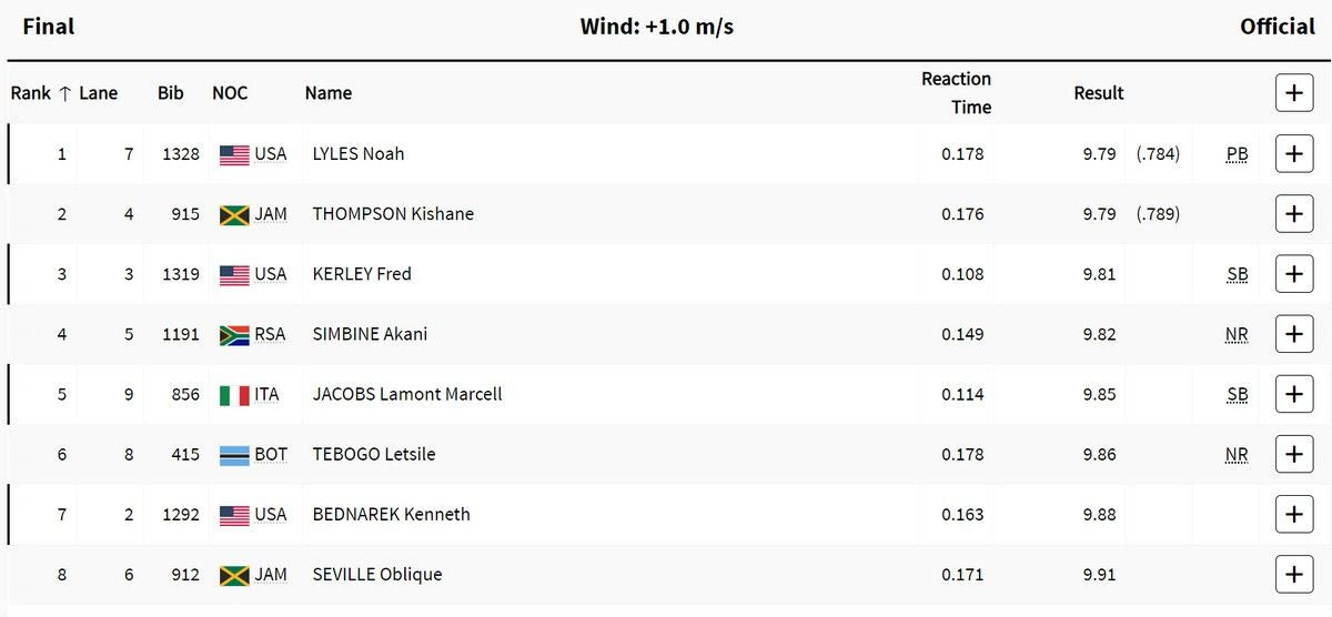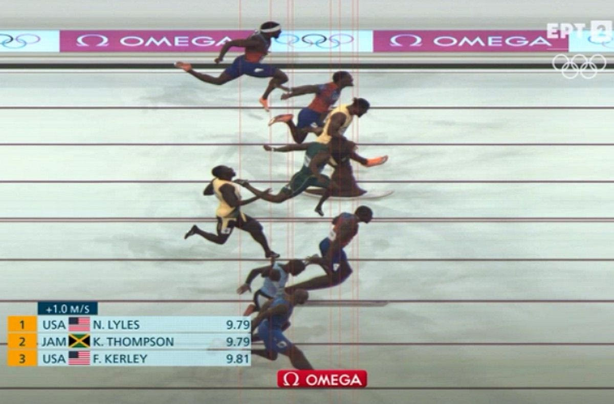 Η κούρσα της μιας ανάσας, η κούρσα που όλοι περίμεναν στους Ολυμπιακούς Αγώνες, η κούρσα που παρακολούθησαν πολλοί αθλητές ανάμεσα στους οποίους και η εθνική ομάδα μπάσκετ των ΗΠΑ, έκοψε την ανάσα. Ο Τζαμαϊκανός Κισέιν Τόμσον έγραψε κι αυτός 9.79, με τον Λάιλς να πατάει όμως στην κορυφή χάρη στο φώτο φίνις (9.784 – 9789 σύμφωνα με το BBC) και να ονειρεύεται το 2/2 όταν θα τρέξει στα 200 μέτρα που είναι το “καλό” του αγώνισμα.