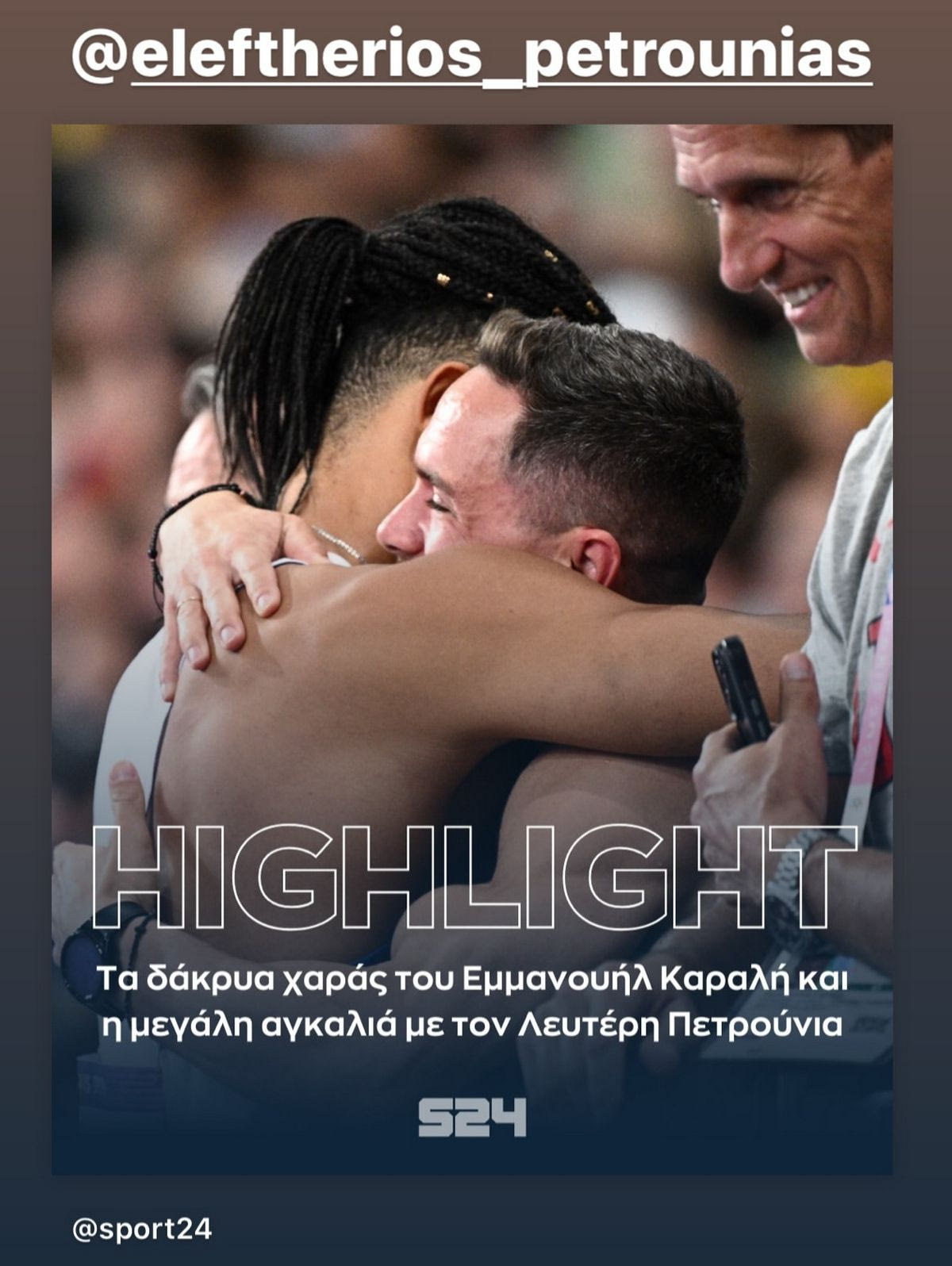 Ένα από τα αμέτρητα highlights της ιστορικής βραδιάς του Εμμανουήλ Καραλή ήταν και η αγκαλιά του με τον Λευτέρη Πετρούνια, με τους δύο χάλκινους ολυμπιονίκες να πρωταγωνιστούν στην ανάρτηση του SPORT24, που έσπευσε να αναδημοσιεύσει ο "Μανόλο".