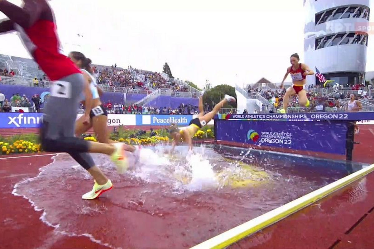 Ο Γερμανίδα αθλήτρια δεν υπολόγισε σωστά το άλμα της στο εμπόδιο πριν από τον λάκκο με το νερό και έκανε… βουτιά. Όταν βγήκε, είχε χάσει πολύτιμο χρόνο και τελικά τερμάτισε στην 8η θέση της σειράς της με 9:30.81 και αποκλείστηκε από τη συνέχεια.