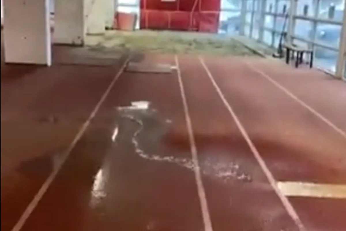 Η οροφή έσταζε και το νερό της βροχής έπεφτε πάνω στο ταρτάν όπου γίνονται οι προπονήσεις στα άλματα εις μήκος και όπου μεταξύ άλλων προπονείται και ο Μίλτος Τεντόγλου.