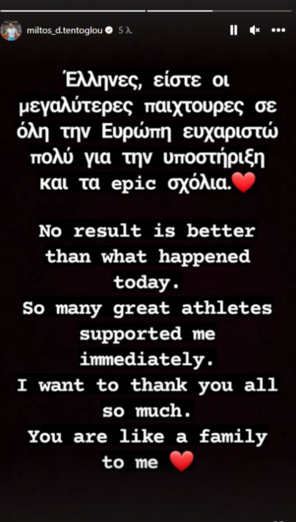 Κανένα αποτέλεσμα δεν είναι καλύτερο από αυτό που συνέβη σήμερα. Πολλοί μεγάλοι αθλητές με υποστήριξαν άμεσα. Θέλω να σας ευχαριστήσω όλους. Είστε σαν οικογένεια για εμένα” έγραψε στο μήνυμά του.