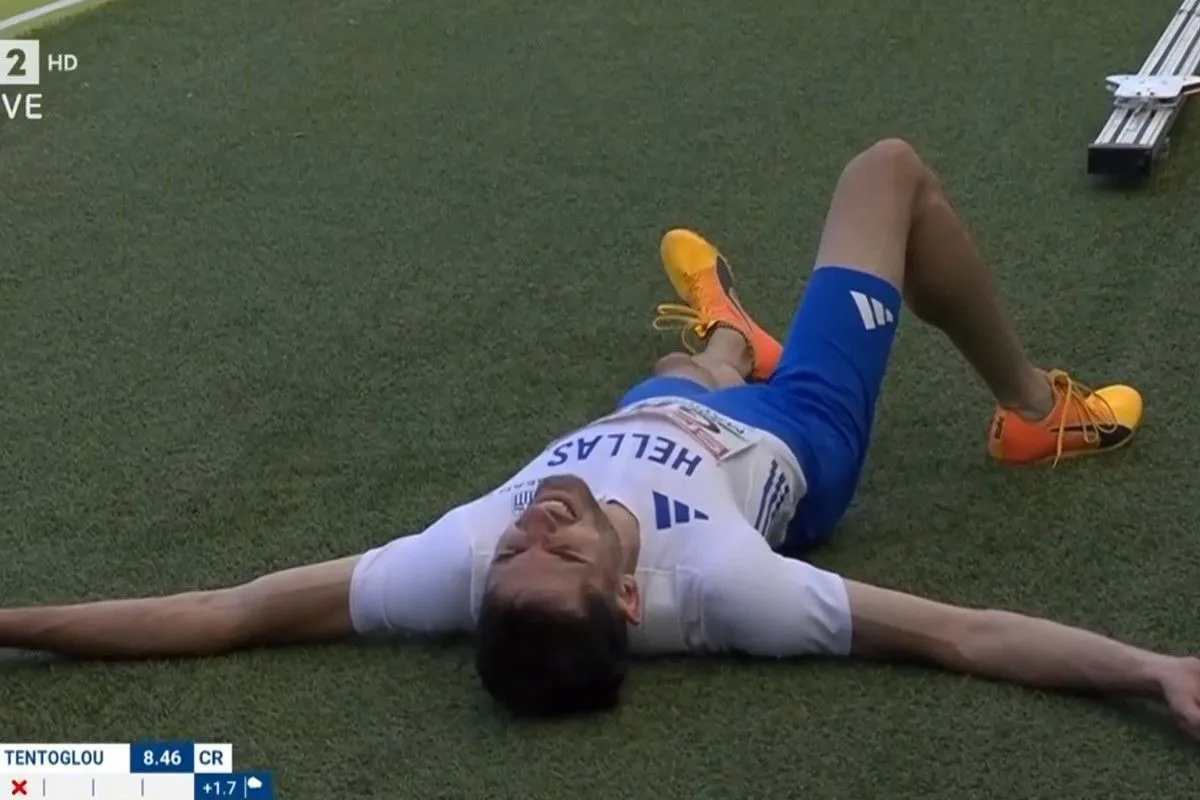 Ο Έλληνας πρωταθλητής έκανε ένα πολύ καλό άλμα και όταν κατάλαβε πως θα μπορούσε να πετύχει πανελλήνιο ρεκόρ έπεσε στο έδαφος απογοητευμένος.