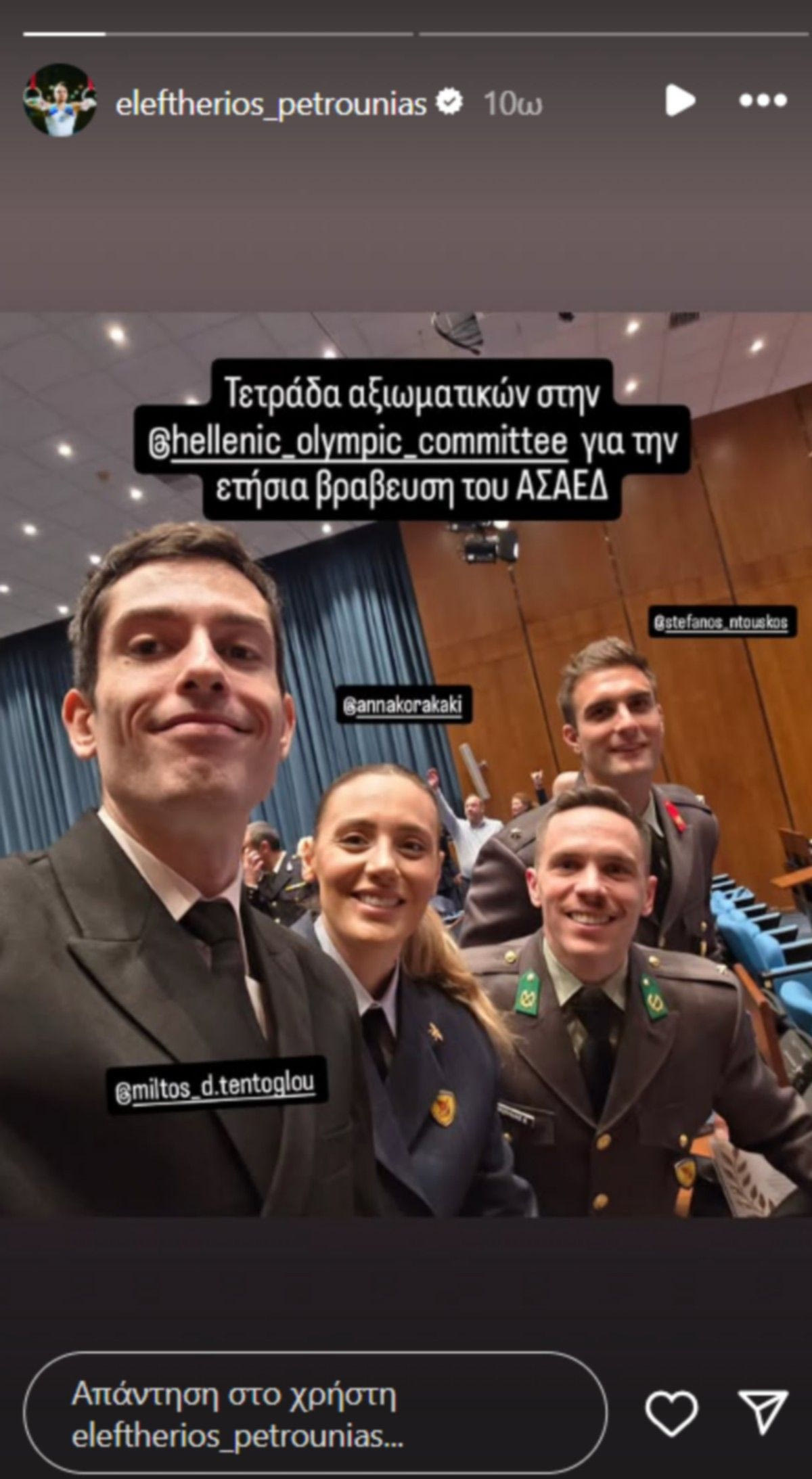 Ο Λευτέρης Πετρούνιας, ο Μίλτος Τεντόγλου, η Άννα Κορακάκη και ο Στέφανος Ντούσκος, όλοι τους μέλη των Ενόπλων Δυνάμεων, απαθανατίστηκαν σε μια χαμογελαστή σέλφι, την οποία ανάρτησε στα social media ο άρχοντας των κρίκων.