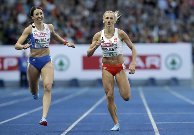 Greece's silver medalist Maria Belibasaki, left, and Poland's gold medalist Justyna Swiety-Ersetic ceopmete during a women's 400 meter final race at the European Athletics Championships in Berlin, Germany, Saturday, Aug. 11, 2018. (AP Photo/Michael Sohn)