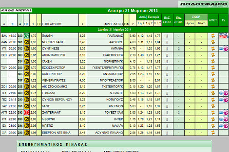 Διαβάστε συνοπτικά στατιστικά, ειδήσεις και εκτιμήσεις για όλα τα παιχνίδια του κουπονιού της Δευτέρας (31/3). Πηγή: Betblog.gr