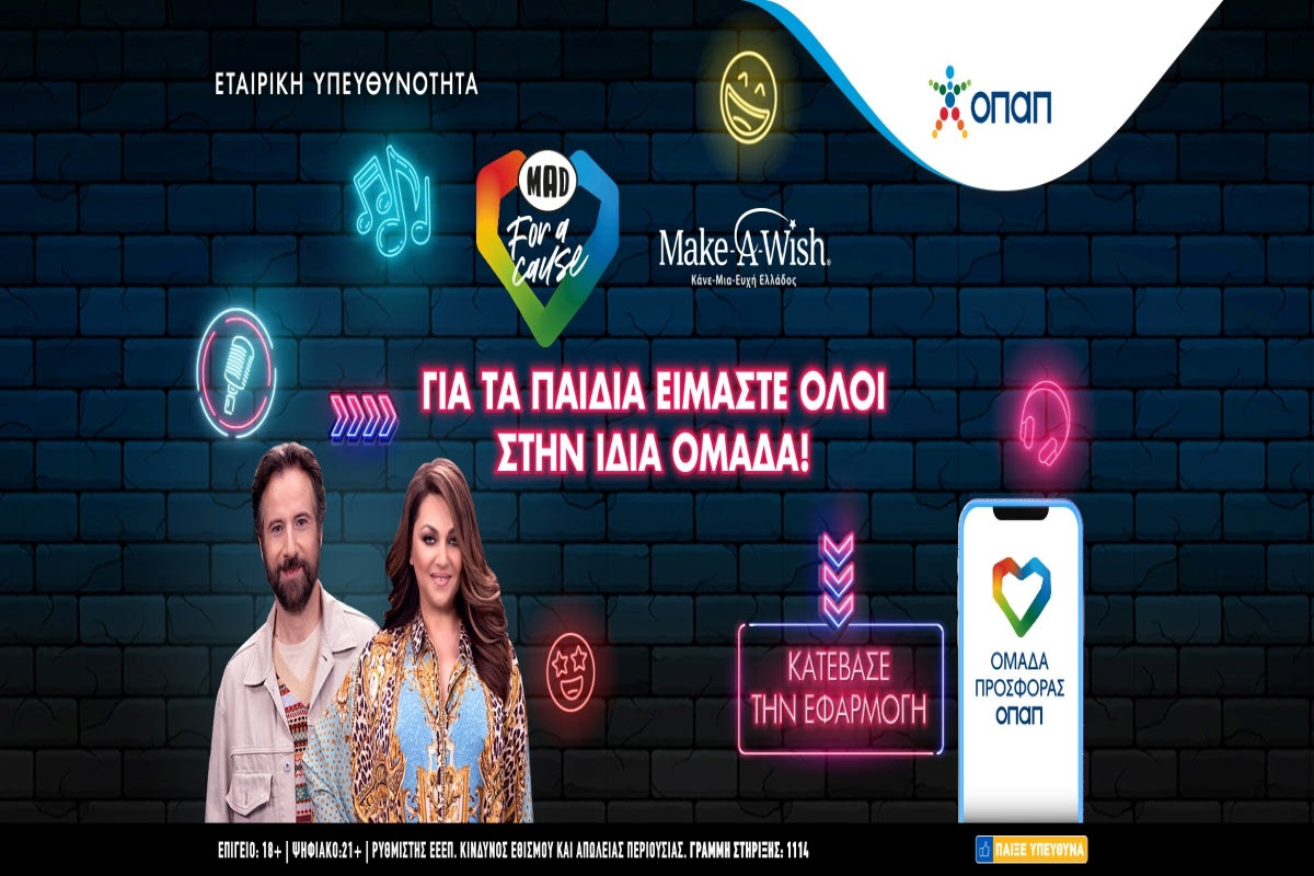 Τέσσερα παιδιά του Make-A-Wish (Κάνε-Μια-Ευχή Ελλάδος), που πάσχουν από σοβαρά νοσήματα, θα δουν τις ευχές τους να γίνονται πραγματικότητα μέσα από την πρωτοβουλία “MAD For a Cause”, που υλοποιεί ο ΟΠΑΠ με την υποστήριξη του MAD. Στην εκπλήρωση των παιδικών ευχών μπορούμε να συμβάλουμε όλοι δωρεάν, μπαίνοντας στην «Ομάδα Προσφορά ΟΠΑΠ». Παράλληλα, διεκδικούμε δύο δώρα εμπειρίας από την Καίτη Γαρμπή και τον Κωστή Μαραβέγια, οι οποίοι υποστηρίζουν τη σημαντική πρωτοβουλία του ΟΠΑΠ για παιδιά.