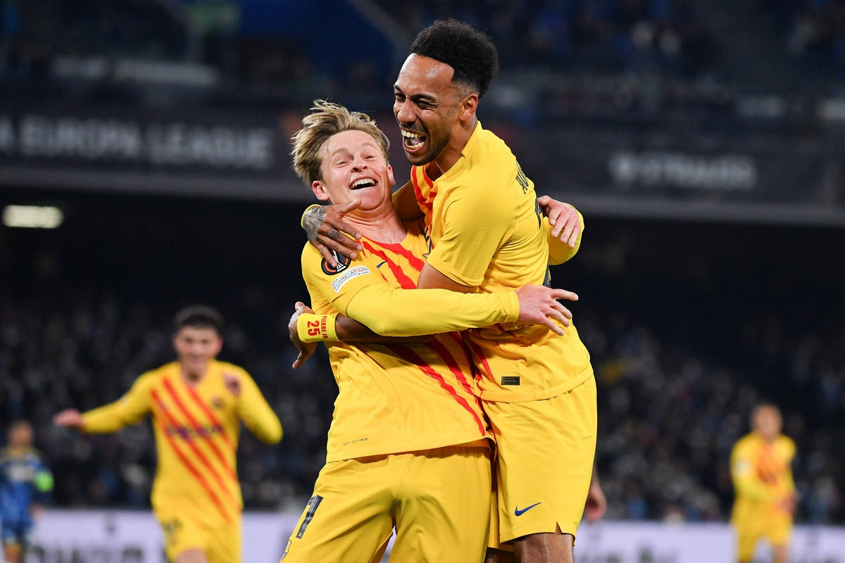 February 24, 2022, Naples, Italy: Naples, Italy, Diego Armando Maradona stadium, February 24, 2022, Barcelona s defender Jordi Alba celebrates with Pierre-Emerick Aubameyang after scoring the 0-2 goal during SSC Napoli vs FC Barcellona - football Europa League match. football Europa League match - SSC Napoli vs FC Barcellona, Naples, Italy PUBLICATIONxINxGERxSUIxAUTxONLY - ZUMAl164 20220224_zsa_l164_850 Copyright: xCarmeloxImbesix imago images/ZUMA Press