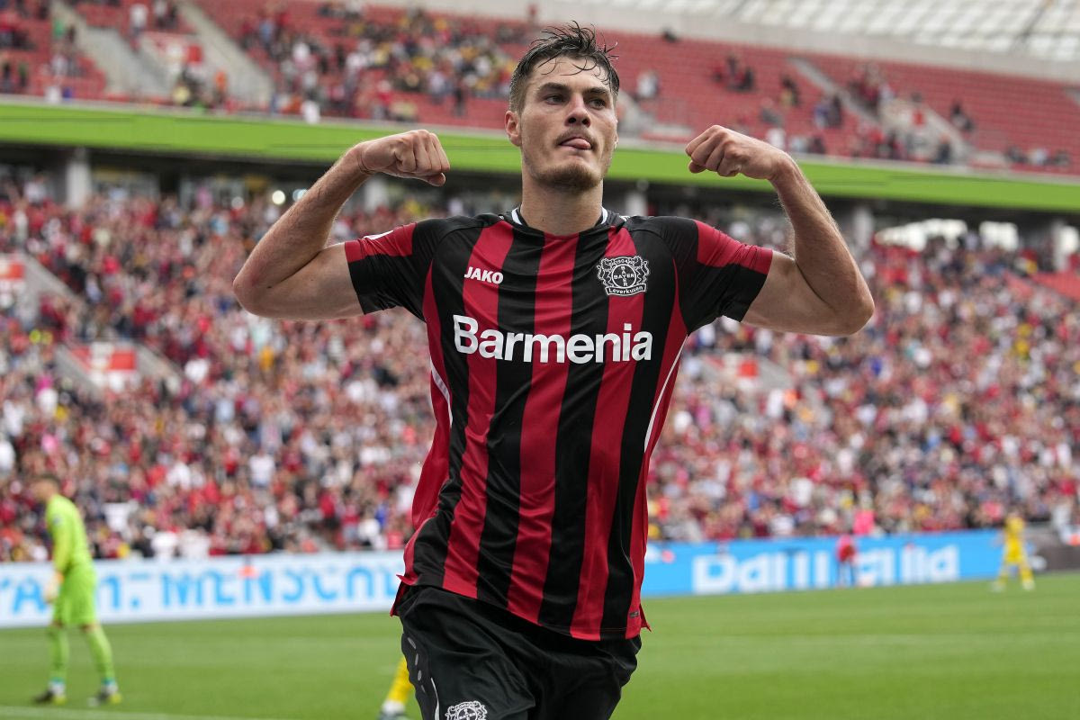 Ο άσος της Λεβερκούζεν, Πάτρικ Σικ πανηγυρίζει το γκολ του κόντρα στην Ντόρτμουντ Ⓒ 2022 MARTIN MEISSNER/ASSOCIATED PRESS