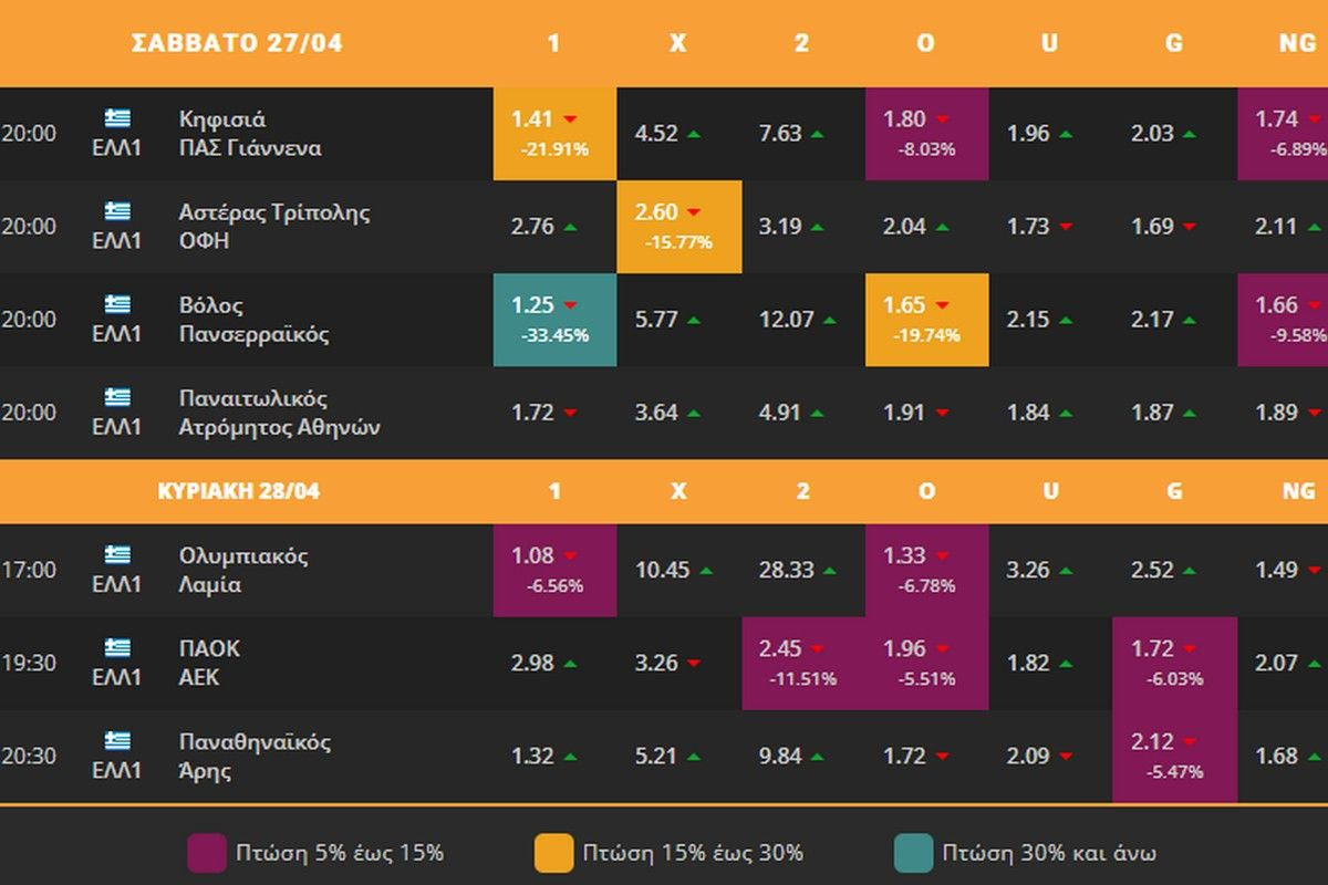 Μεγάλο ενδιαφέρον παρουσιάζουν οι πτώσεις αποδόσεων στην επερχόμενη αγωνιστική της Stoiximan Super League φτάνοντας μέχρι και το 33% - Το Betmarket.gr έχει το ρεπορτάζ!