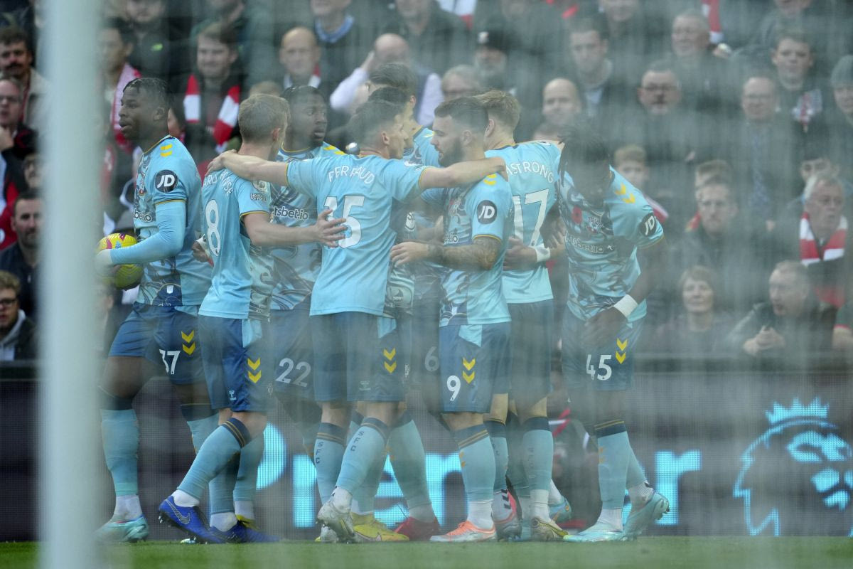 Οι παίκτες της Σαουθάμπτον πανηγυρίζουν το γκολ του Τσε Ανταμς στο Ανφιλντ © 2022 JON SUPER/ASSOCIATED PRESS