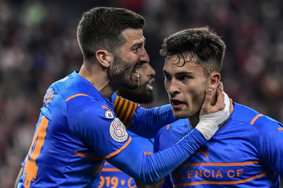 Valencia's Hugo Duro, right, celebrates with his teammate after scoring his side's first goal during a Spanish Copa del Rey semifinal first leg soccer match between Athletic Club and Valencia at the San Mames stadium in Bilbao, Spain, Thursday, Feb. 10, 2022. (AP Photo/Alvaro Barrientos) © 2023 Alvaro Barrientos/Associated Press