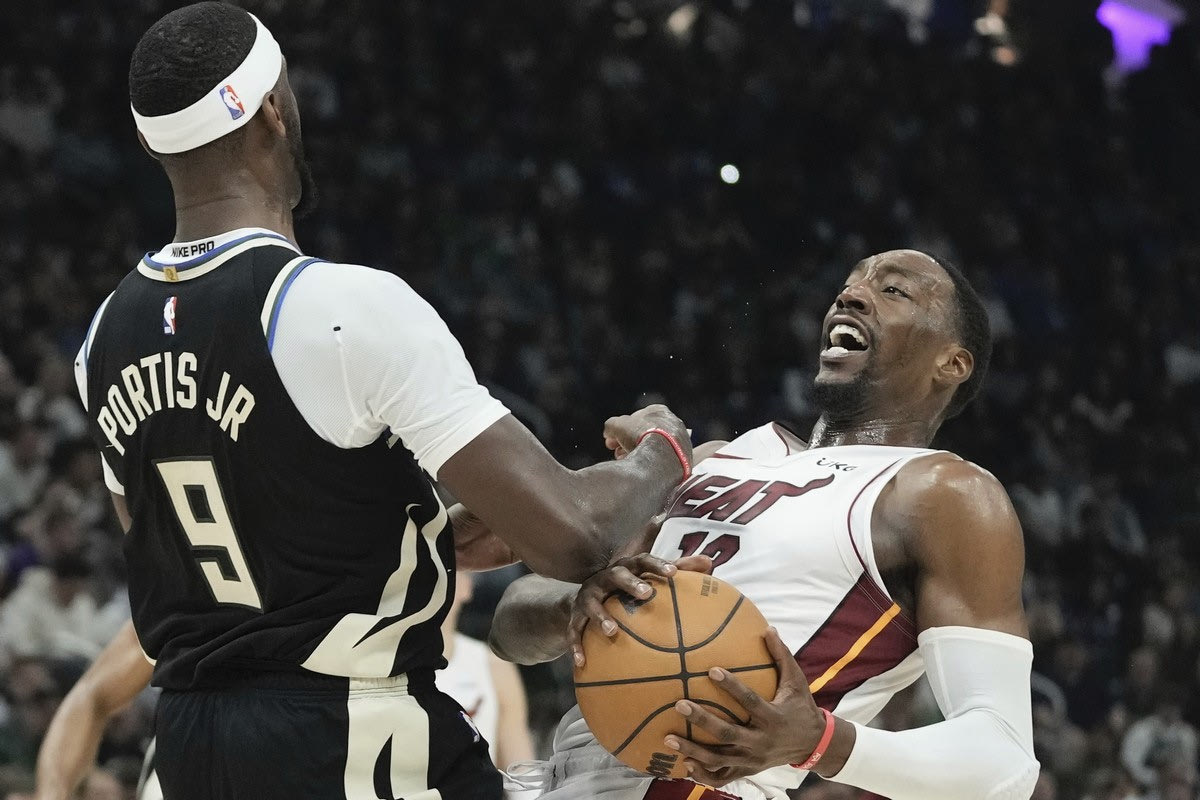 Milwaukee Bucks' Bobby Portis draws a charge on Miami Heat's Bam Adebayo during the first half in Game 1 of an NBA basketball first-round playoff game Sunday, April 16, 2023, in Milwaukee. (AP Photo/Morry Gash) © 2023 Morry Gash/Associated Press