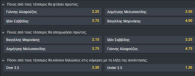 Από εκεί και πέρα, το να μιλήσουν και οι τέσσερις μετά το ραντεβού, έχει απόδοση 3,30 και να μιλήσουν τρεις και κάτω προσφέρεται στο 1,30.