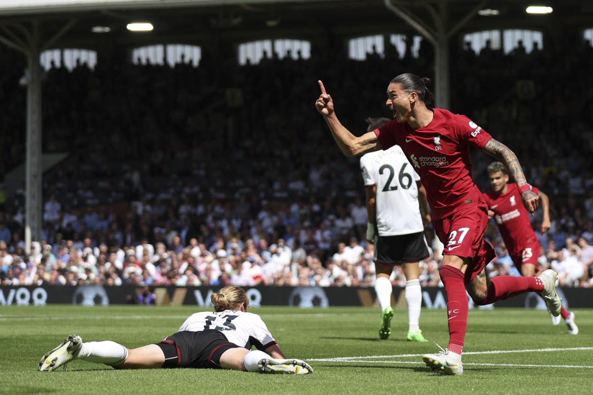 Ο Ντάργουιν Νούνιες πανηγυρίζει το γκολ του κόντρα στη Φούλαμ στην πρεμιέρα της Λίβερπουλ στην Premier League 2022/23 © 2022 IAN WALTON/ASSOCIATED PRESS