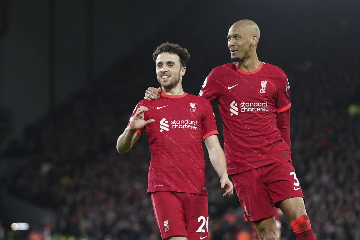 Ο Ντιόγκο Ζότα πανηγυρίζει μαζί με τον Φαμπίνιο γκολ της Λίβερπουλ κόντρα στην Λέστερ για την Premier League | 10 Φεβρουαρίου 2022 @2022 Jon Super/AP IMAGES
