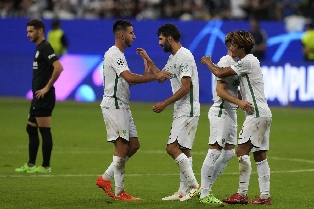 Οι παίκτες της Σπόρτινγκ πανηγυρίζουν τη νίκη τους κόντρα στην Αϊντραχτ για την πρώτη αγωνιστική των ομίλων του Champions League 2022/23 © 2022 MICHAEL PROBST/ASSOCIATED PRESS