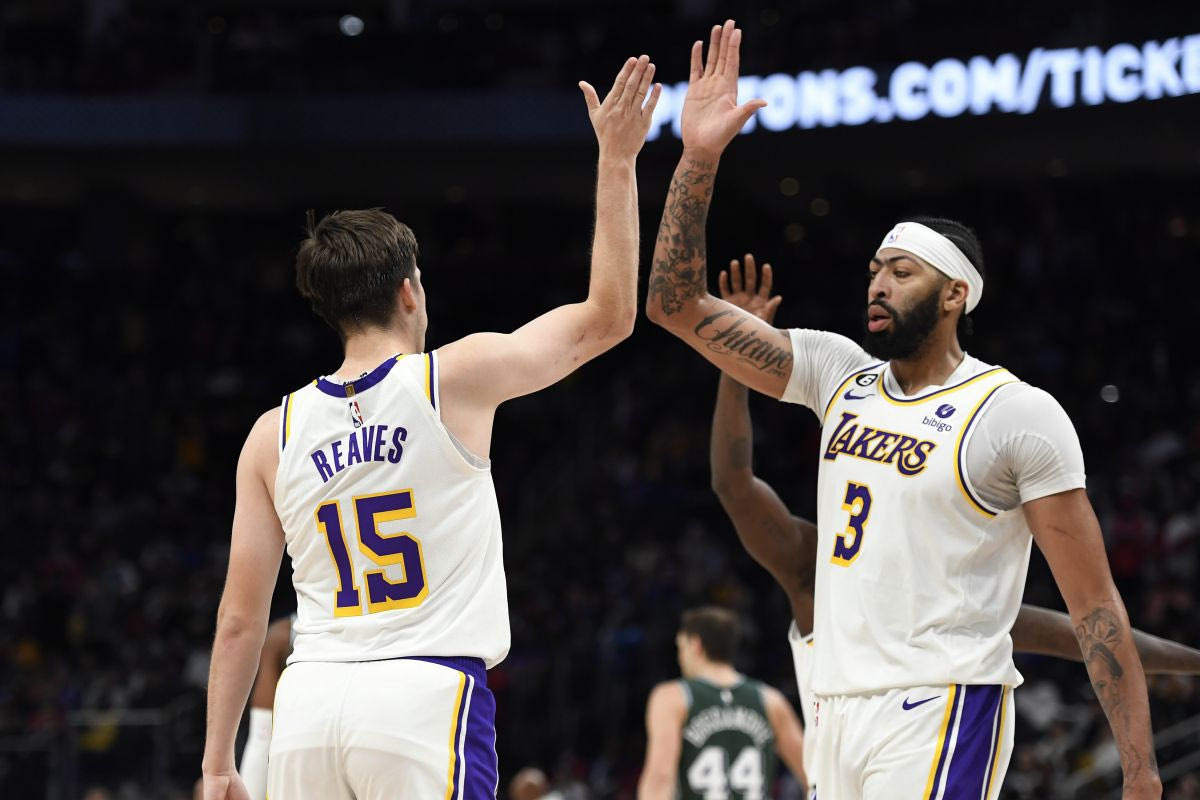 Ο Αντονι Ντέιβις συγχαίρει τον Οστιν Ριβς στο παιχνίδι των Λέικερς με τους Πίστονς για τη regular season του NBA 2022/23. © 2022 JOSE JUAREZ/ASSOCIATED PRESS