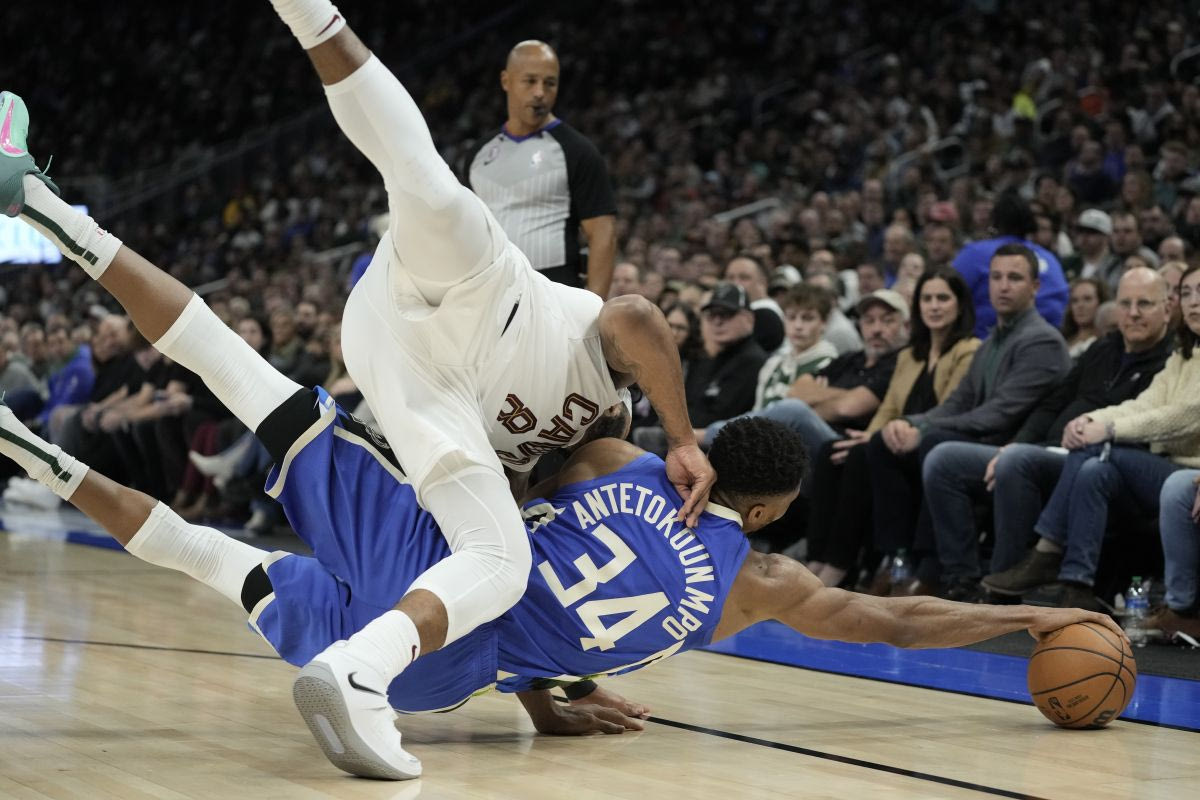 Ο Γιάννης Αντετοκούνμπο βουτάει για να σώσει την μπάλα κόντρα στους Κλίβελαντ Καβαλίερς. © 2022 MORY GASH/ASSOCIATED PRESS