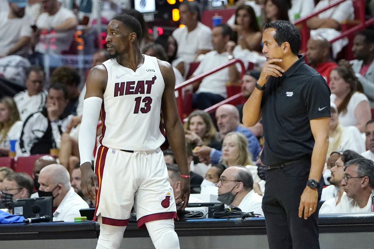 Ο Μπαμ Αντεμπάγιο και ο τεχνικός των Μαϊάμι Χιτ, Έρικ Σποέλστρα στο παιχνίδι με τους Ατλάντα Χοκς © 2022 LYNNE SLADKY/ASSOCIATED PRESS