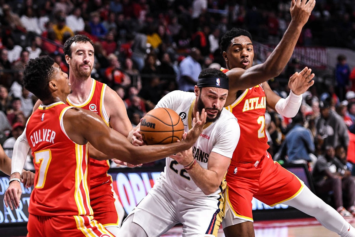 NBA, Basketball Herren, USA Atlanta Hawks at New Orleans Pelicans Oct 14, 2022 Birmingham, Alabama, USA New Orleans Pelicans forward Larry Nance Jr. 22 is defended by Atlanta Hawks guard Jarrett Culver 7 in the fourth quarter at Legacy Arena at BJCC. Birmingham Legacy Arena at BJCC Alabama USA, EDITORIAL USE ONLY PUBLICATIONxINxGERxSUIxAUTxONLY Copyright: xLarryxRobinsonx 20221014_cec_zq1_247 IMAGO/USA TODAY Network