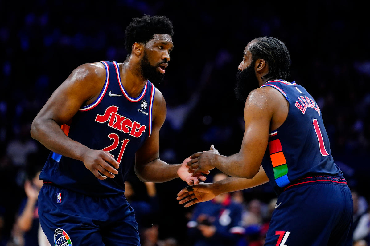 Philadelphia 76ers' Joel Embiid, left, and James Harden celebrate during the first half of an NBA basketball game against the Dallas Mavericks, Friday, March 18, 2022, in Philadelphia. (AP Photo/Matt Slocum) 2022 AP Photo/Matt Slocum