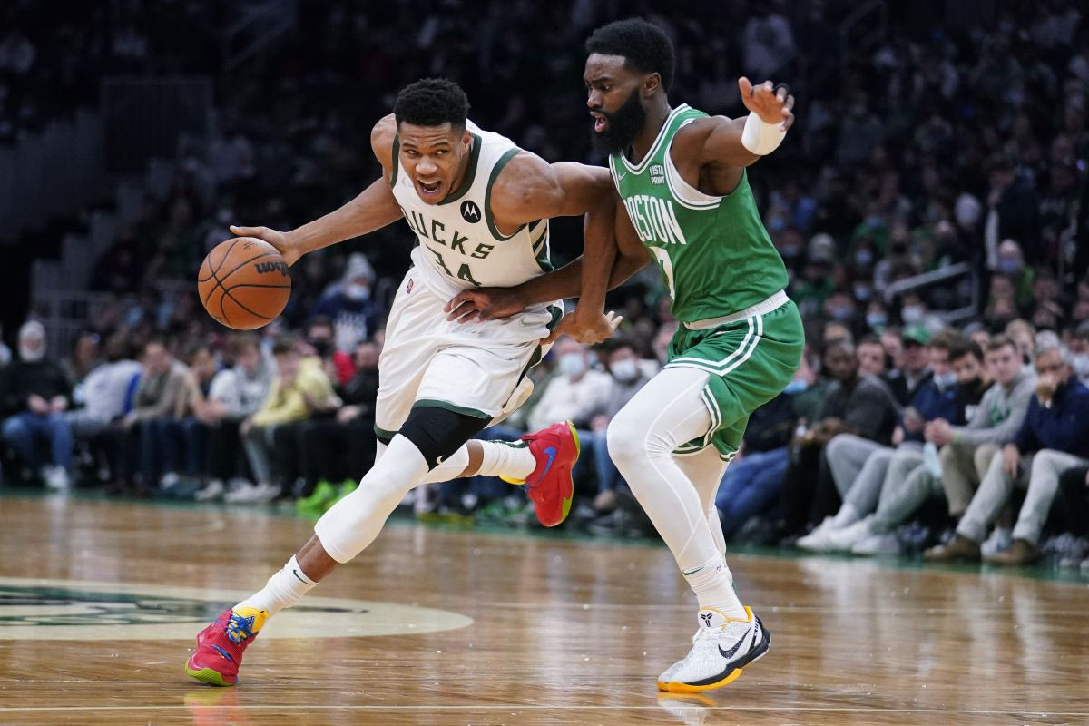 Ο Τζέιλεν Μπράουν των Μπόστον Σέλτικς μαρκάρει τον Γιάννη Αντετοκούνμπο των Μιλγουόκι Μπακς Ⓒ 2021 CHARLES KRUPA/ASSOCIATED PRESS