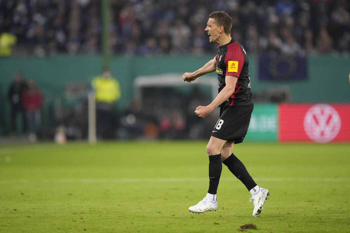 Ο άσος της Φράιμπουργκ, Νιλς Πέτερσεν, πανηγυρίζει το γκολ του κόντρα στο Αμβούργο για τον ημιτελικό του κυπέλλου Γερμανίας. © 2022 MARTIN MEISSNER/ASSOCIATED PRESS