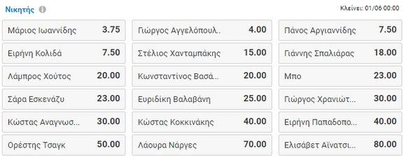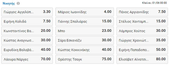 Ο Πάνος Αγριαννίδης είναι τρίτο φαβορί για τη νίκη και αμετακίνητος στο 7.50, ενώ η Σάρα Εσκενάζυ παίζεται στο 30.00 από 23.00 και είναι στη 10η θέση.