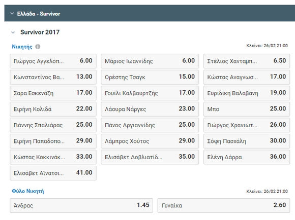 Τα τρία μεγάλα φαβορί (Αγγελόπουλος, Ιωαννίδης, Χανταμπάκης) είδαν της αποδόσεις τους στον Stoiximan να πέφτουν από την Πέμπτη. Συγκεκριμένα οι δύο πρώτοι από το 7.00 πήγαν στο 6.00, ενώ ο τρίτος από το 8.00 στο 6.50.