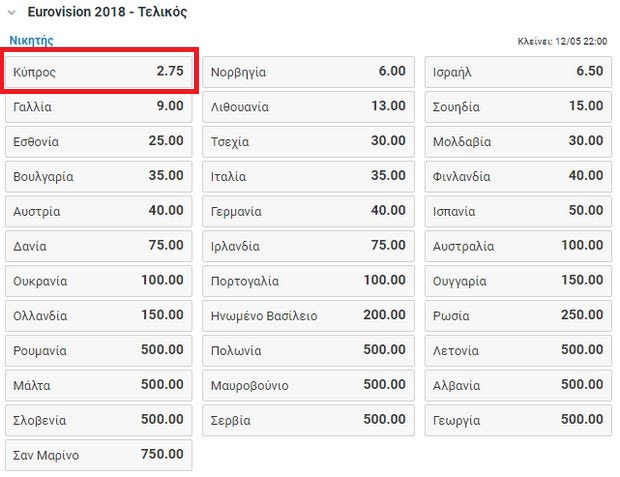 Την Πέμπτη (10/5) η απόδοση της Κύπρου έπεσε κι άλλο! Αυτή τη στιγμή, μια ενδεχόμενη νίκη της 31χρονης τραγουδίστριας δίνει 2.75 στο Stoiximan.gr την ώρα που δεύτερη έρχεται η Νορβηγία του Αλεξάντερ Ρίμπακ με απόδοση 6.00.