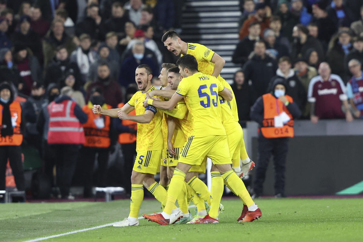 Οι παίκτες της Ντιναμό Ζάγκρεμπ πανηγυρίζουν γκολ στο Λονδίνο κόντρα στη Γουέστ Χαμ © 2022 Ian Walton/Associated Press