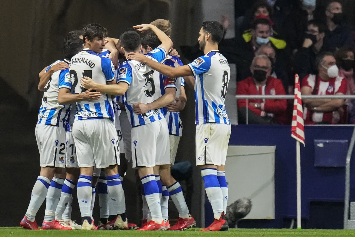 Οι παίκτες της Ρεάλ Σοσιεδάδ πανηγυρίζουν γκολ σε ματς της La Liga κόντρα στην Ατλέτικο Μαδρίτης | 24 Οκτωβρίου 2021 @2021 Manu Fernandez/AP IMAGES