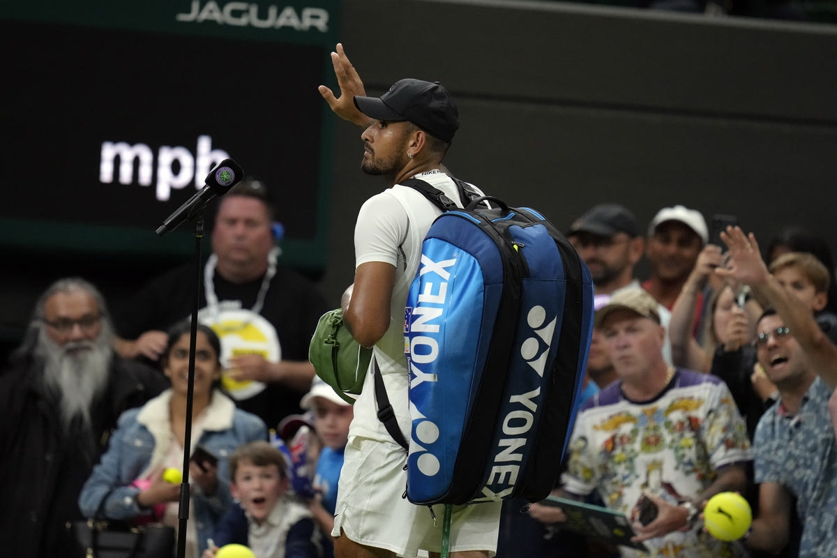 Ο Νικ Κύργιος με μαύρο καπέλο κατά την αποχώρησή του από το κορτ μετά τη νίκη του επί του Στέφανου Τσιτσιπά | 2 Ιουλίου 2022 @2022 Kirsty Wigglesworth/AP IMAGES