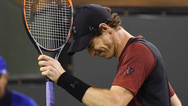 Andy Murray, of Great Britain, reacts after losing a point to Vasek Pospisil, of Canada, at the BNP Paribas Open tennis tournament, Saturday, March 11, 2017, in Indian Wells, Calif. Pospisil won the match 6-4, 7-6 (5). (AP Photo/Mark J. Terrill)
