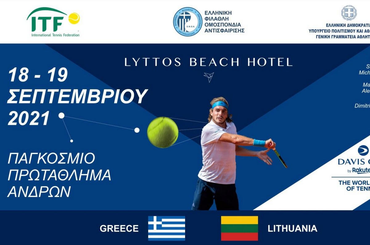 Με την αιγίδα του Υφυπουργείου Αθλητισμού και της Περιφέρειας Κρήτης και τη στήριξη του Δήμου Χερσονήσου, στις 18 & 19 Σεπτεμβρίου 2021, η Εθνική Ομάδα Τένις, αποτελούμενη από τους Στέφανο Τσιτσιπά, Μιχάλη Περβολαράκη, Πέτρο Τσιτσιπά, Μάρκο Καλοβελώνη, Αλέξανδρο Σκορίλα, με προπονητή τον Δημήτρη Χατζηνικολάου και αρχηγό της τον Απόστολο Τσιτσιπά θα αγωνιστεί στις άρτιες αθλητικές εγκαταστάσεις του LYTTOS BEACH, Χερσόνησος Ηρακλείου, με αντίπαλο την Λιθουανία, για την άνοδό της στο GROUP I του Παγκόσμιου Πρωταθλήματος DAVIS CUP, που διοργανώνεται από την Ελληνική Φίλαθλη Ομοσπονδία Αντισφαίρισης, με ανάθεση από την Διεθνή Ομοσπονδία Αντισφαίρισης (ITF).