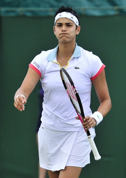 German player Eleni Daniilidou reacts as she plays with Serbian player Ana Ivanovic during the women's single at the Wimbledon Tennis Championships at the All England Tennis Club, in southwest London on June 23, 2011. AFP PHOTO / GLYN KIRK RESTRICTED TO EDITORIAL USE (Photo credit should read GLYN KIRK/AFP/Getty Images)