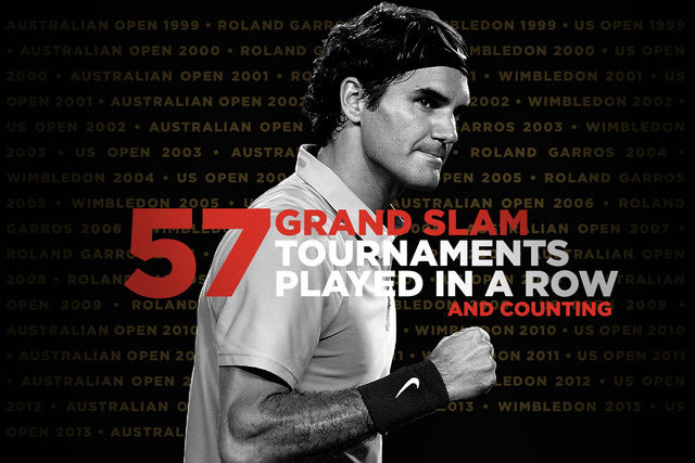 Το απόλυτο ρεκόρ συμμετοχών στα Grand Slams έχει ένας από τους αγαπημένους παίκτες του Φέντερερ, ο Φαμπρίς Σαντόρο με 70. Ο Φέντερερ είναι τρίτος στη λίστα με 58 ισόβαθμος (και) με τον Λέιτον Χιούιτ, από τον οποίο έχασε στο Μπρισμπέιν την περασμένη εβδομάδα.