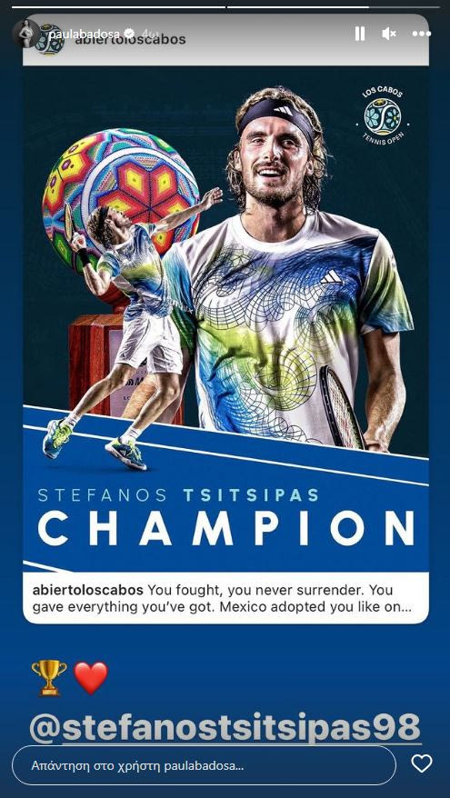 Την κατάκτηση του τίτλου στο Los Cabos του Μεξικό από τον Στέφανο Τσιτσιπά πανηγύρισε μέσα από ανάρτησή της στο Instagram η αγαπημένη του, Πάουλα Μπαντόσα.