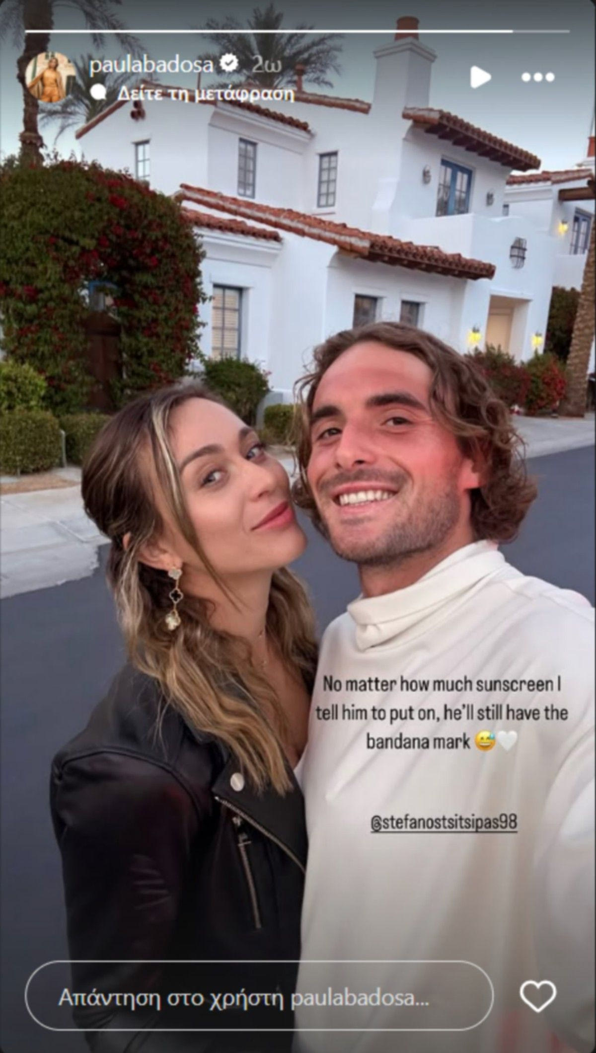 Η Ισπανίδα τενίστρια δημοσίευσε μια φωτογραφία με τον Έλληνα τενίστα, σχολιάζοντας με χιούμορ το χαρακτηριστικό σημάδι από τη μπαντάνα του. “Όσο αντηλιακό και να του πω να βάλει, πάλι θα έχει το σημάδι της μπαντάνας”, έγραψε, συνοδεύοντας το μήνυμά της με emoji.