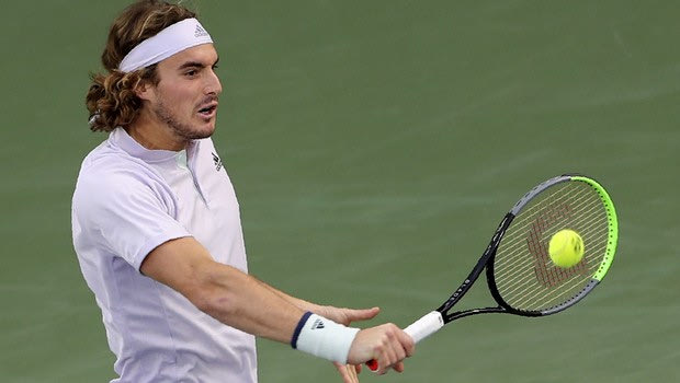 Stefanos Tsitsipas of Greece returns the ball to Germany's Jan-Lennard Struff during a quarter final match of the Dubai Duty Free Tennis Championship in Dubai, United Arab Emirates, Thursday, Feb. 27, 2020. (AP Photo/Kamran Jebreili)