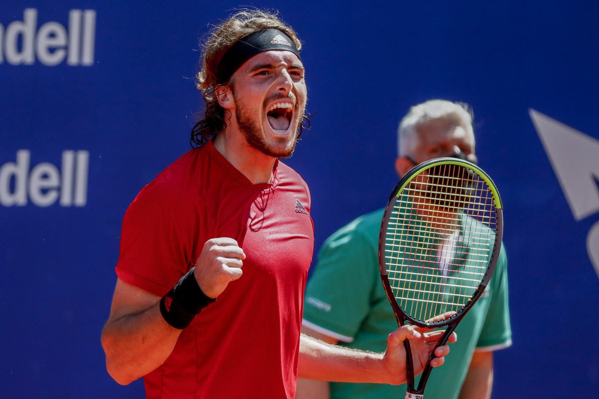Ο Στέφανος Τσιτσιπάς πανηγυρίζει έναν πόντο του επί του Σίνερ στο τουρνουά της Βαρκελώνης /24-04-2021 2021 Joan Monfort/Associated Press