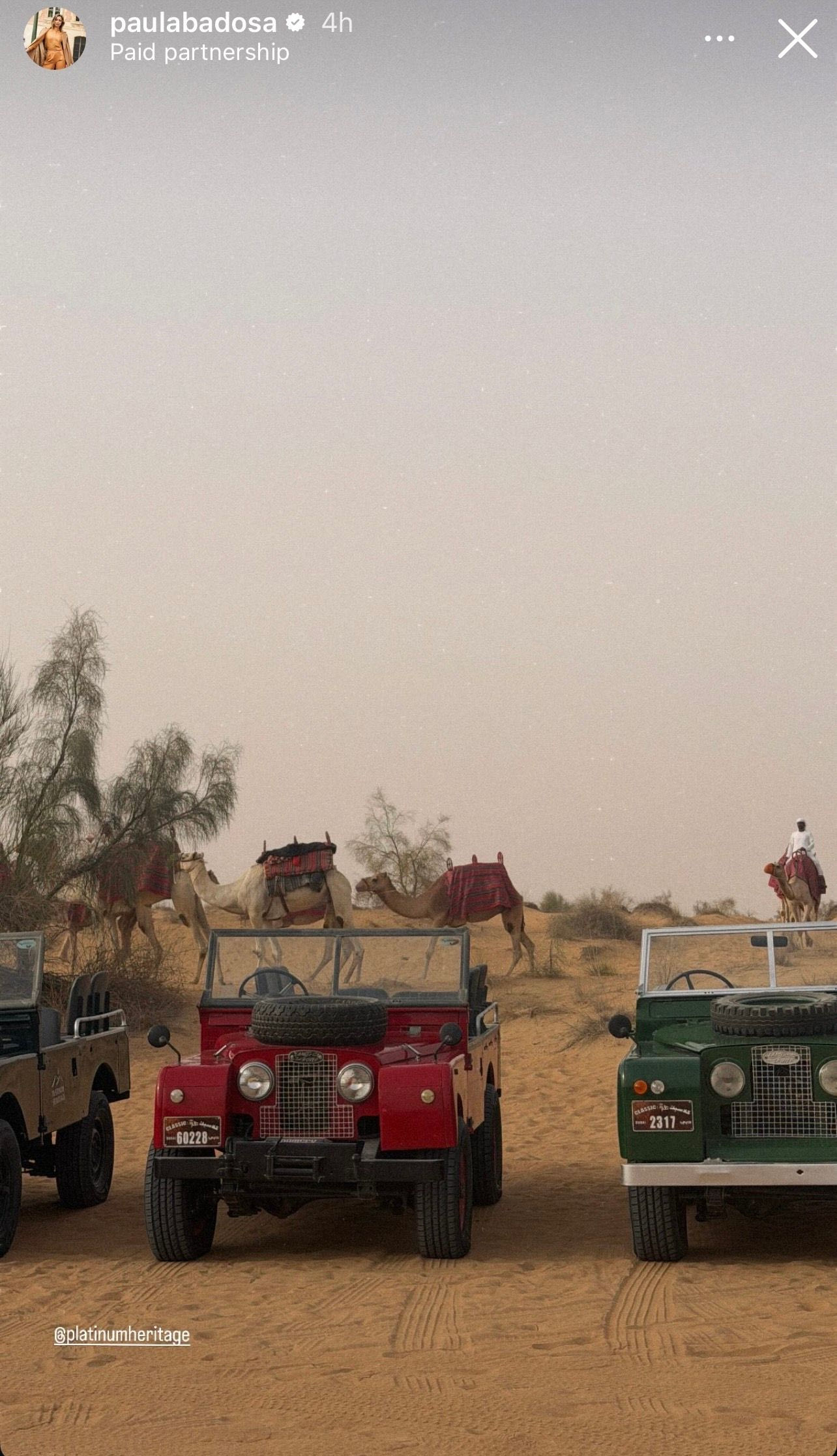 Στο πρώτο story της, η Μπαντόσα μοιράστηκε μια εικόνα από τα παραδοσιακά Land Rover με τα οποία έγινε η εκδρομή, ιδανικά για τα luxury desert safaris.